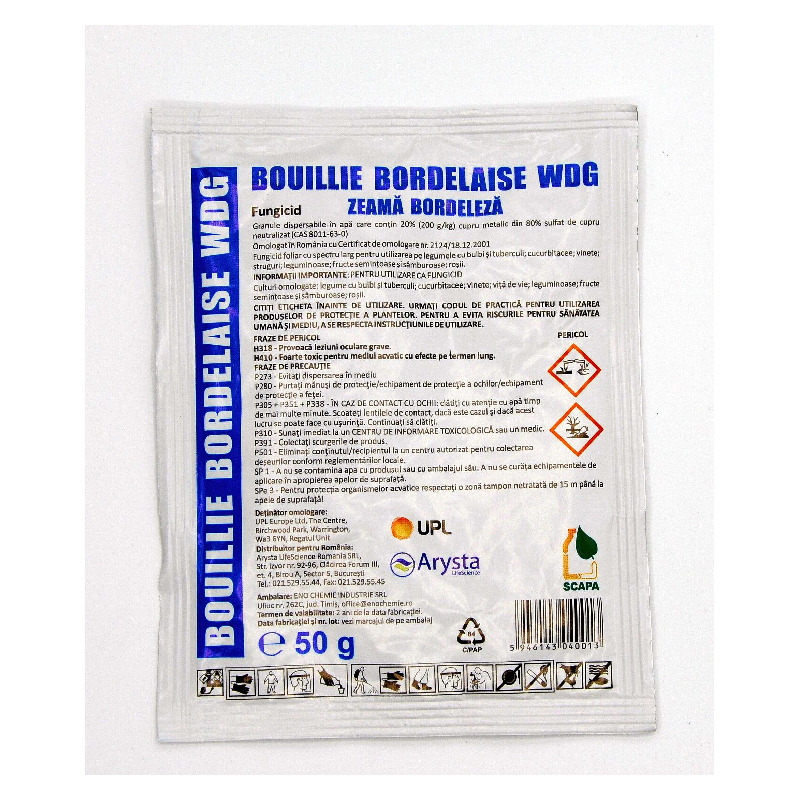 Zeama bordeleza (Bouille Bordelaise WDG), fungicid de contact, pe baza de cupru, care controleaza mai multe boli cauzate de ciuperci si bacterii: alternarioza, rapan, foc bacterian, ciuruire, patare unghiulara etc.